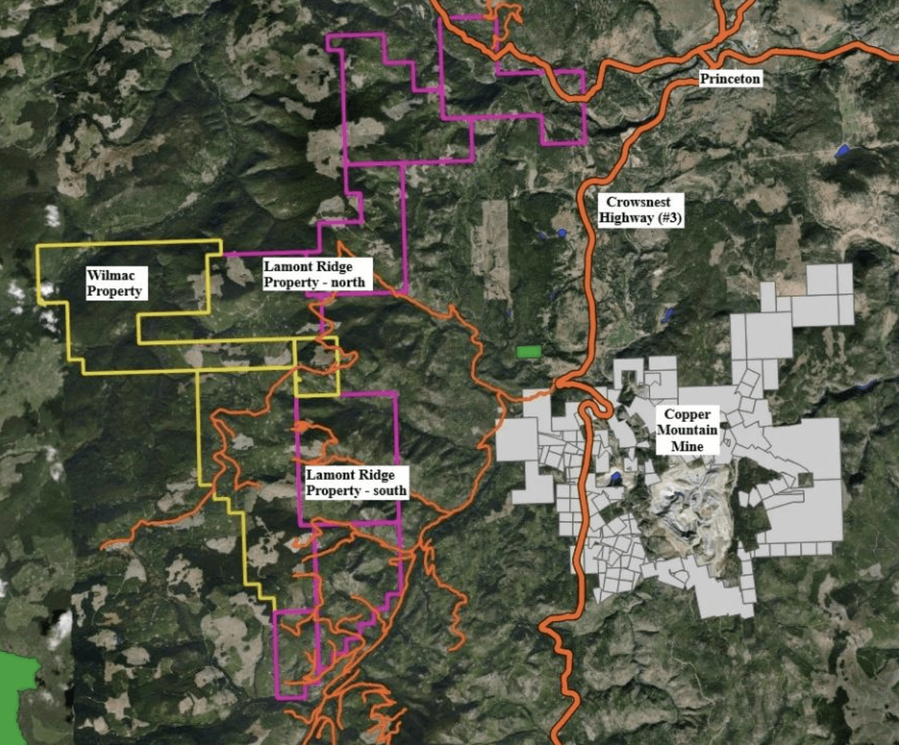 The Lamont Ridge Project is located approximately 200 kilometres east of Vancouver and west to southwest of Princeton, British Columbia in the Similkameen Mining Division. The Property consists of seven contiguous mineral claims with a total area of approximately 7,086 hectares (17,510 acres).