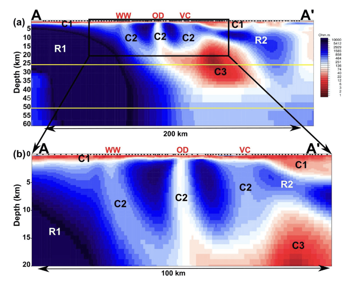 Results from the Lamont Grid are interpreted to be broadly analogous to a regional scale magnetotelluric profile across the Archean Gawler Craton (left-hand side) and Proterozoic mobile belt (right-hand side), Australia. The profile is characterized by very high resistivity (blue colour, R1 and R2) to a depth of more than 60 km. A striking high conductivity structure (C3) is situated at the margins of the Archean Gawler Craton at a depth 15–40 km. In addition, three narrow low-resistivity pathways (C2) extend from conductor C3 to the surface, which link the lower crust with major IOCG-U mineral deposits. Modified from Heinson et al., 2018)