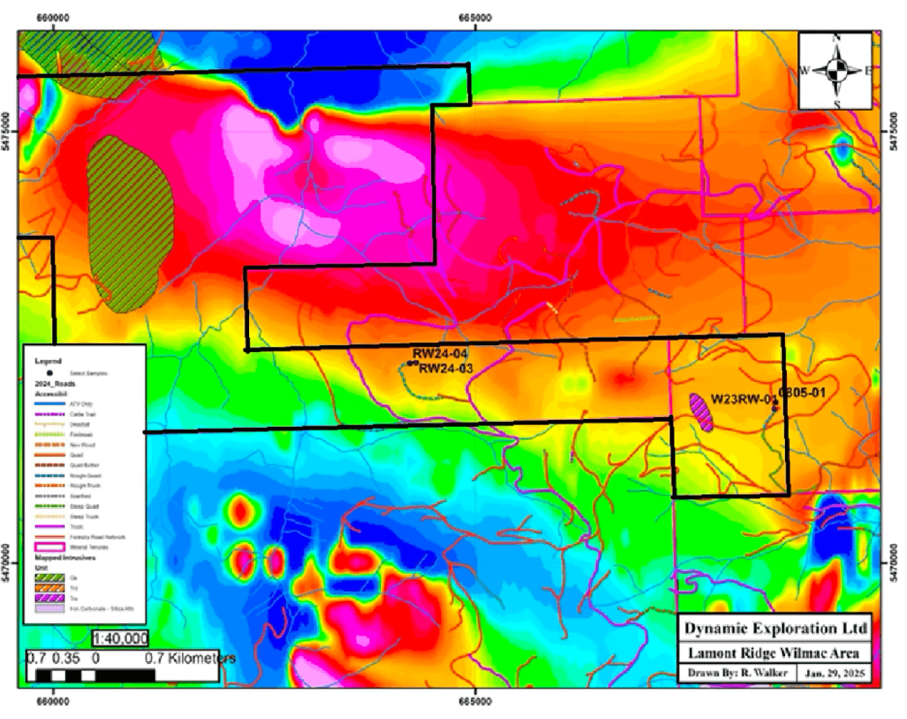 Alteration and mineralization identified at surface, in particular the high-grade mineralization and accompanying alteration exposed in the three trenches in the Wilmac MINFILE occurrence, are interpreted as high-level expressions of a deeper causative source, the parent magma(s)